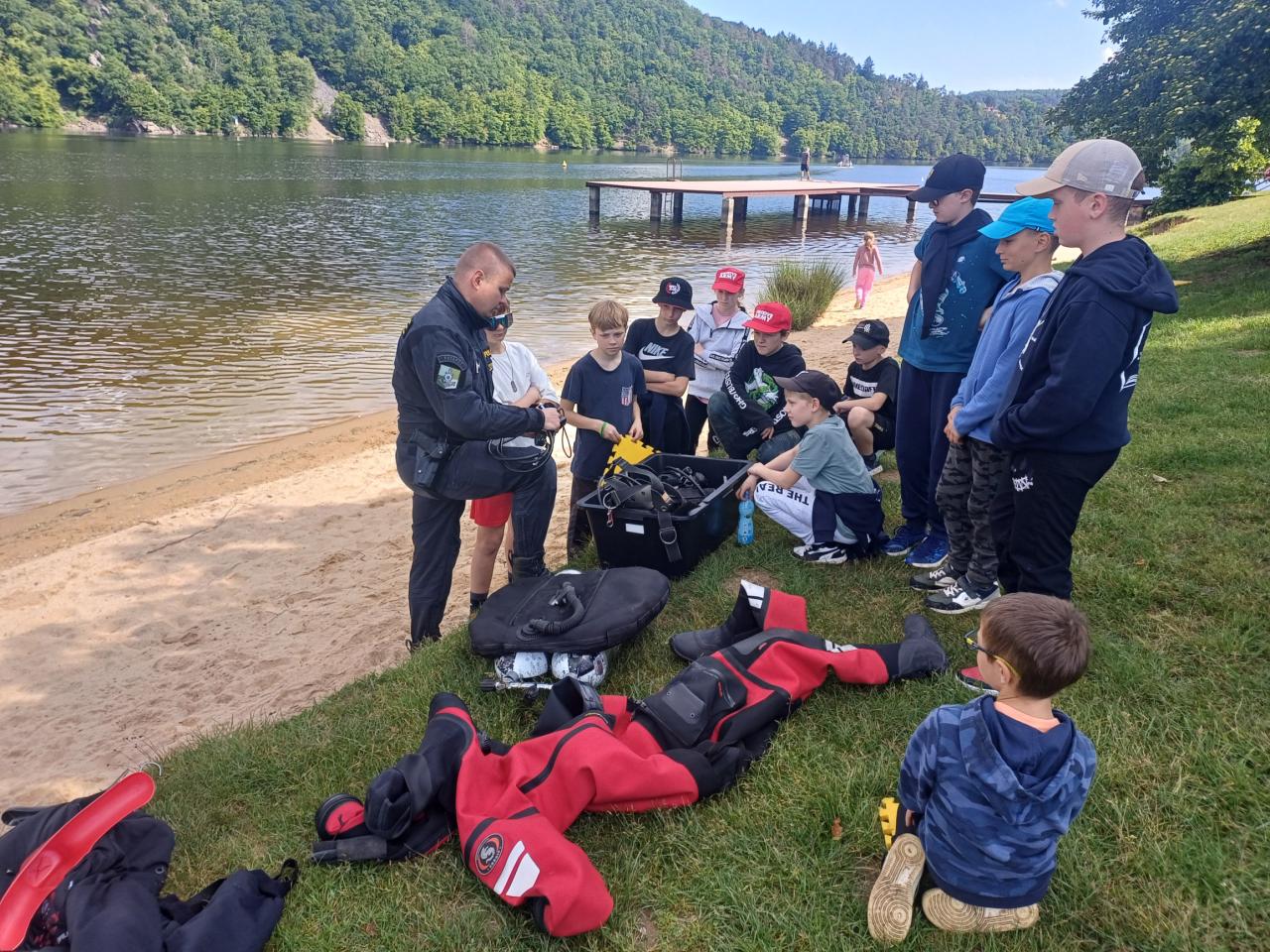 Ve čtvrtek jsme měli už počasí lepší. Nepršelo a bylo i sluníčko. Dopoledne za námi přijel p.ředitel s hasičskou technikou. Děti se dozvěděly nové informace, pluly na loďce a stříkaly vodu na cíl. Pak jsme se věnovali vesmírným hrám. Byli jsme na procházce a cestou jsme se zastavili v obchodě na zmrzlině. Večer si děti začaly balit věci a po večeři jsme byli s další školou na diskotéce. Poslední den jsme si všichni moc užili.